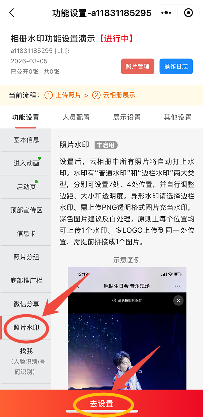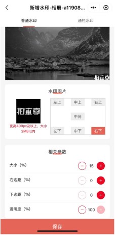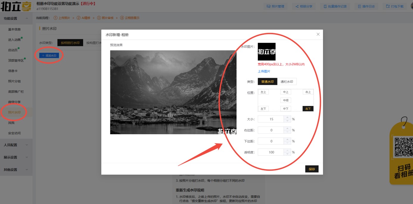 我创建的相册→功能设置→照片水印→添加水印→上传水印(宽高400px及以上,大小2MB以内),选择水印类型、位置,调整大小边距后点击保存。